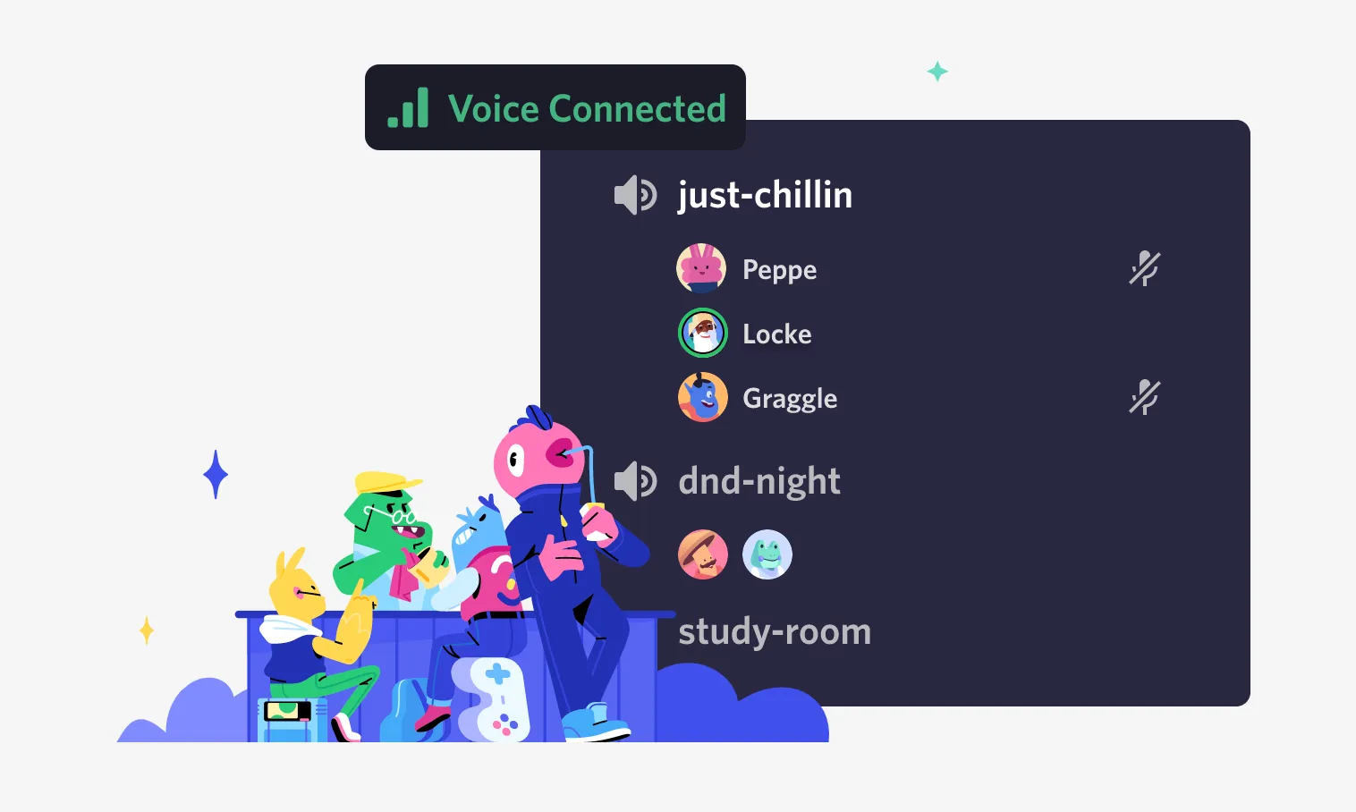 - ボイスチャット:ボイスチャンネルを作成して,複数人での音声通話を楽しむことができます.ノイズ除去機能や通話するグループを簡単に分けることができることなどから,品質の高い通話が可能です.