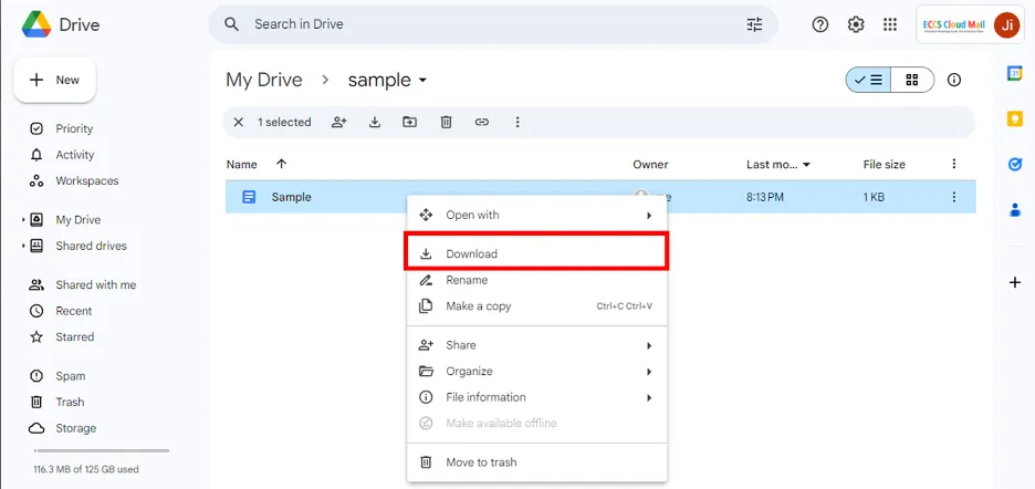 To proceed with the following steps, make sure you are already logged into ECCS Cloud Mail and have Google Drive open in your browser. If you have not completed these two steps, please refer to “Open Google Drive in the browser” on the Google Drive page (an English translation is planned).