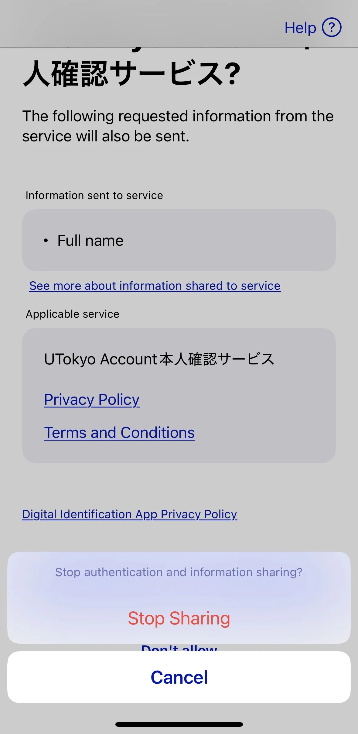 A screen will appear asking for permission to authenticate with the UTokyo Account Identity Verification Service. After reviewing the privacy policy and terms and conditions, tap “Allow”.