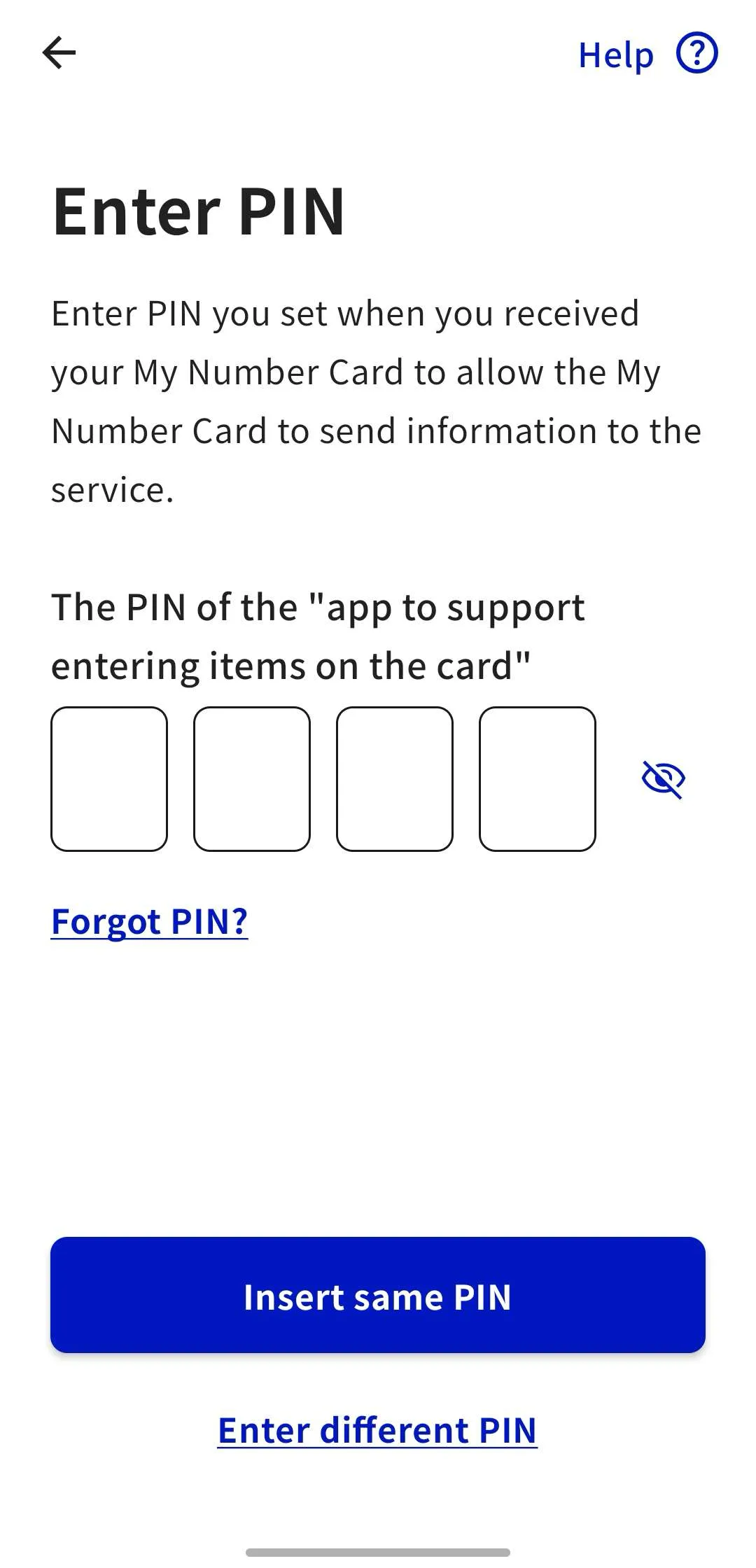 Enter the PIN of the “app to support entering items on the card” (previously referred to as “PIN for Card Info Input Support”). If it is the same as the previous PIN, you can skip this step by tapping “Insert same PIN”.