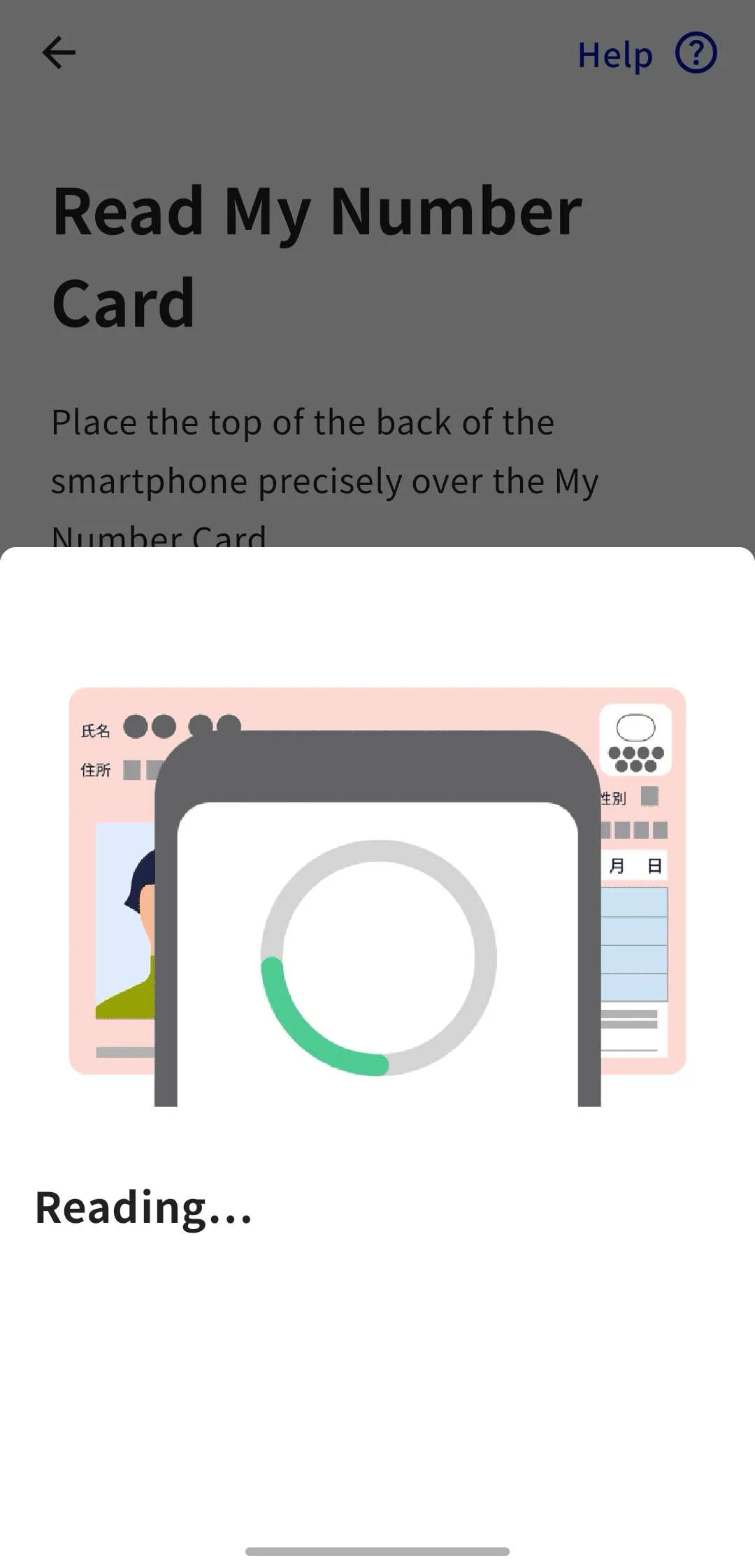 - While the message “Reading…” is displayed, do not move the My Number Card away from your smartphone.