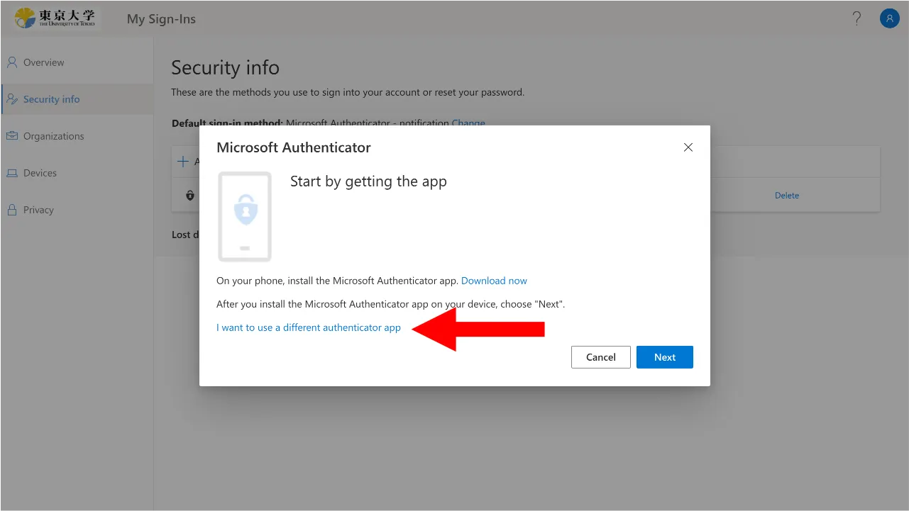 3. Click “I want to use a different authentication app”.