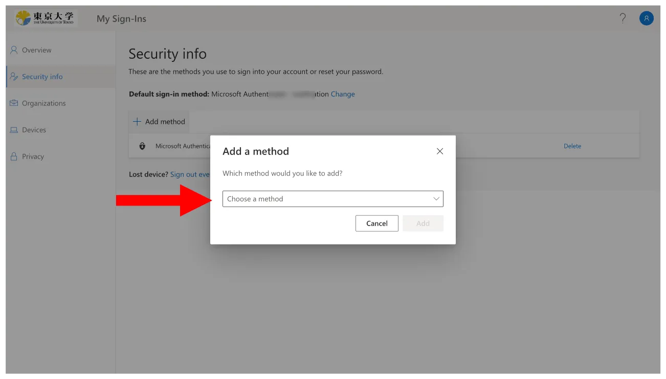 1. Click “Add method” in the Security info page.