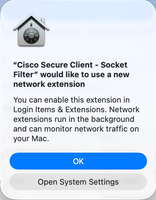 Step D: Wait a moment; a window with the following message “Action Required Cisco Secure Client - System Extension Blocked.” may appear. Please follow the instructions to allow the system software from “Cisco Secure Client - Socket Filter” to click the 🛈️ button, which is displayed in the right of “Network Extensions” in “Login Items & Extensions” in “General” in “System Settings”. When a window with the following message ‘“Cisco Secure Client - Socket Filter” Would Like to Filter Network Content’ appears, please click the “Allow” button.