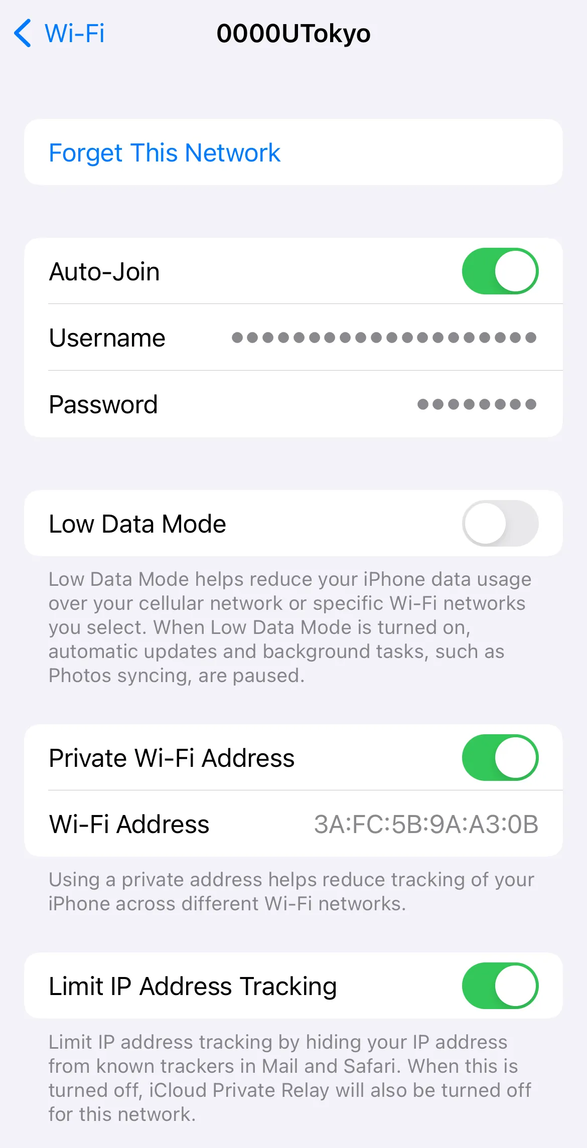 If the screen for entering a user-name and a password does not appear in Step 2 and it fails to connect to the Wi-Fi, you need to delete the existing setting and register a new one. This is necessary because although once you reissue your account and your previous account becomes invalid, your devices may still store it. Before using the new account, your devices must “forget” the previous one. There is no need to worry about never being able to connect to the UTokyo Wi-Fi again upon “deleting” a account.Tap the SSID found in Step 2, select “Forget this Network”. When the screen saying “Forget Wi-Fi network “0000UTokyo”?” comes up, select “Forget”.