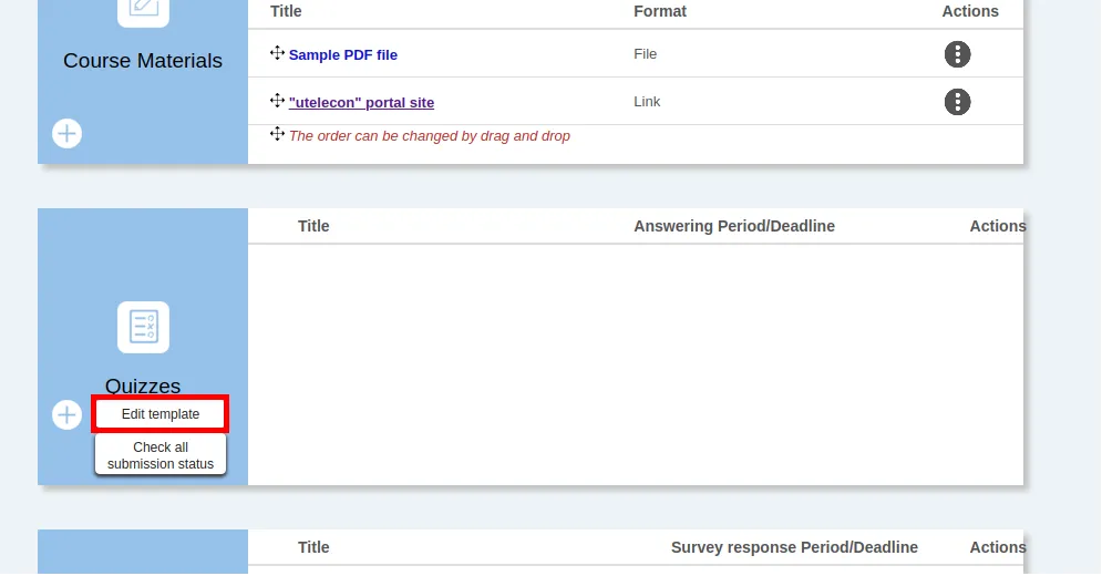 - On the “Course Top” screen, click on “Edit template” in the “Quizzes” column. The “Quiz Template list” screen will appear.