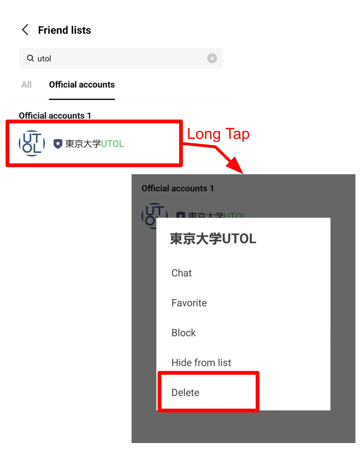 - Look for “東京大学 UTOL” under the “official account” tab, or search for it in the search window, then press and hold the “東京大学 UTOL”.
