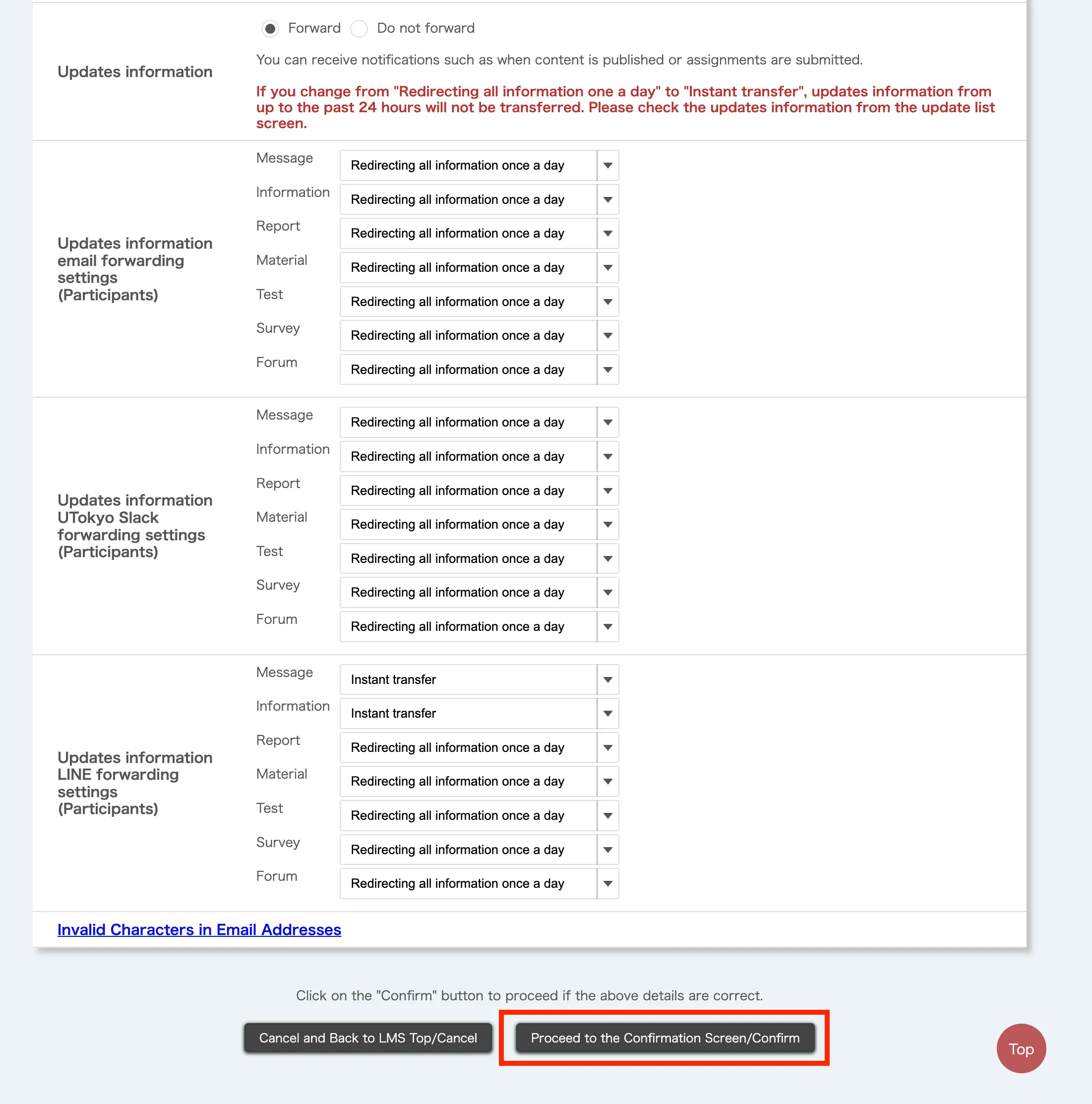 - Click the relevant link under the “Updates information email/LINE/UTokyo Slack forwarding settings” (in blue) at the top right of the screen.