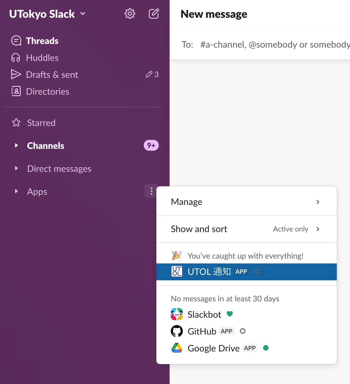 - Notification will be sent via direct message from “UTOL通知” (Slack App). You can view these direct messages by opening the “UTOL通知” in the Apps menu.