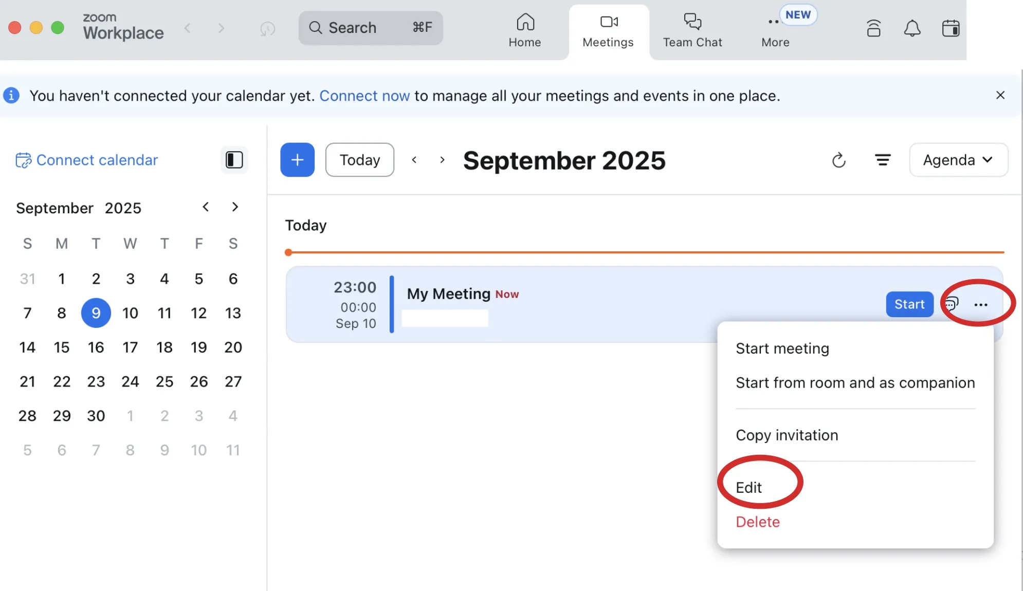 • Hover over the meeting you want to operate on, and click the Edit button that appears. This opens the Edit “My Meeting(This is where the name of the meeting you scheduled will be inserted)” screen.