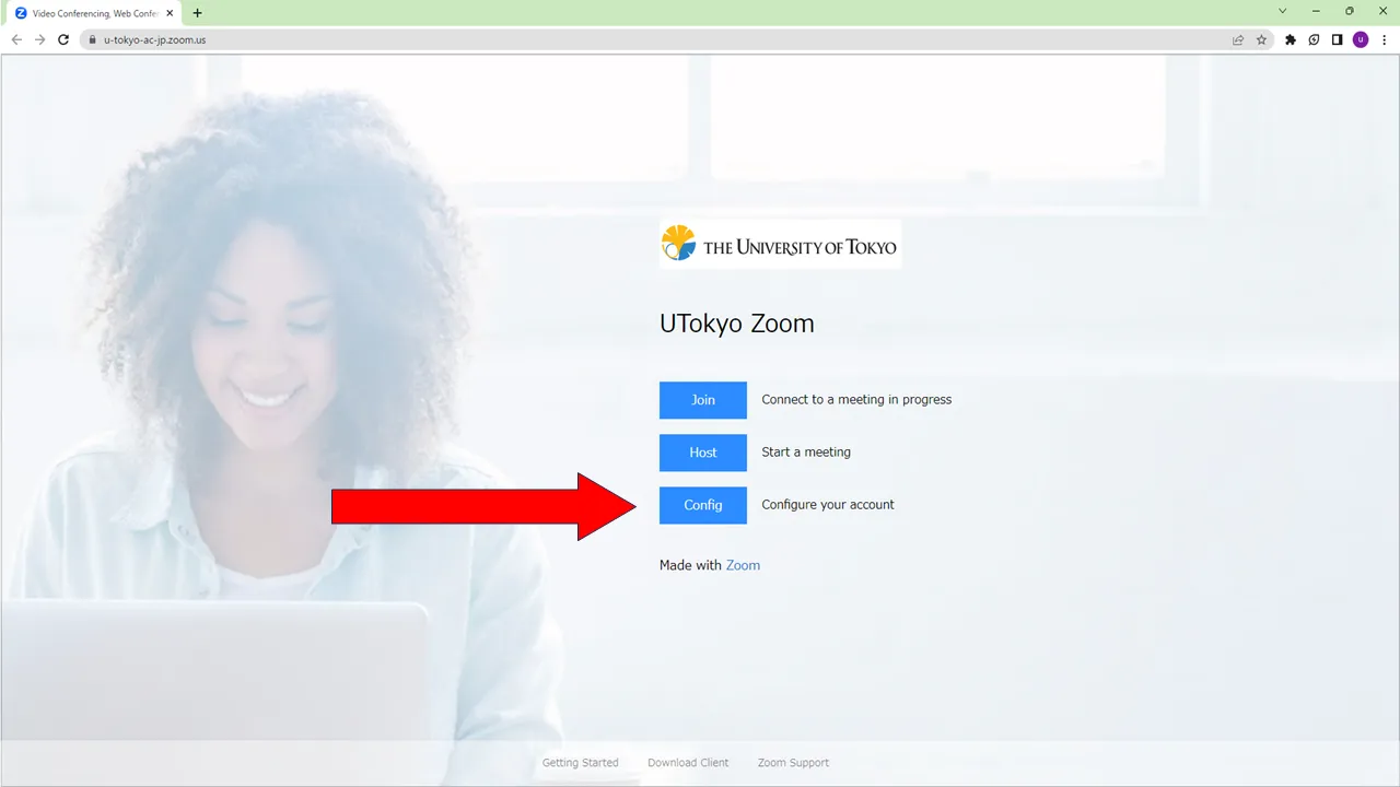 - 「UTokyo Zoom」と書かれたページが表示されるので,そのページにある「Config」と書かれたボタンを押してください.