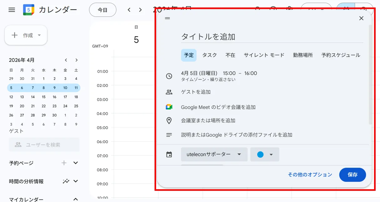 - 予定を入れたい時間帯または左上にある「作成」を押してください.下の画像の赤枠部分のような画面が表示されます.