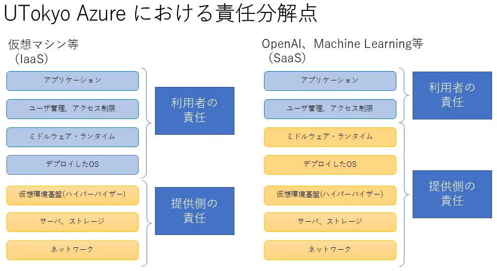 UTokyo Azure は Microsoft Azure サービスの資源を利用したクラウドサービスなので,その責任分解点は主に IaaS であるか SaaS であるかで2通りに分類されます。