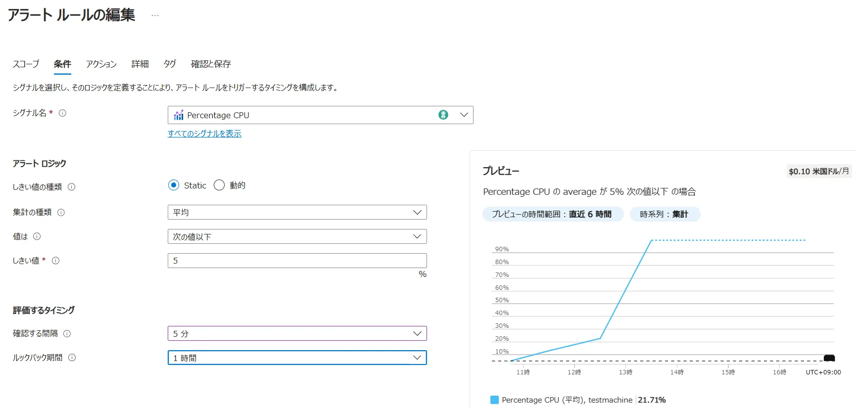 条件パート- シグナル名:監視するステータスを選択します.ここではCPU使用率を監視するので、