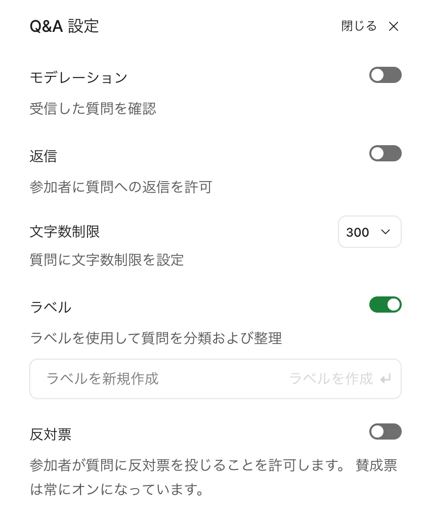 - ラベル:この設定をオンにすると,質問を分類・管理するためのタグ(ラベル)機能を使用できます.また,「ラベルを新規作成」欄から,新しいラベルを作成することができます.