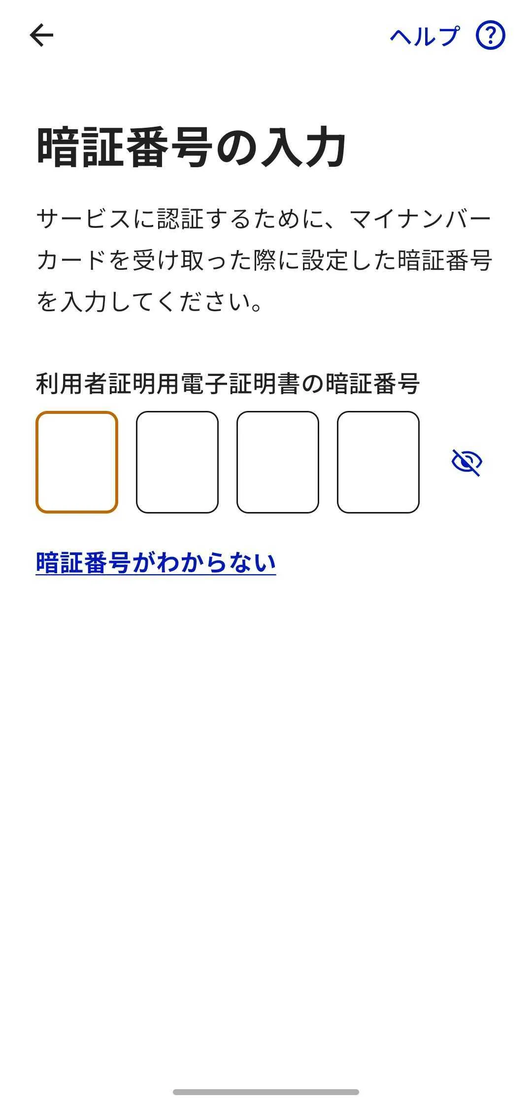 マイナンバーカードの利用者証明用電子証明書の暗証番号を入力してください.