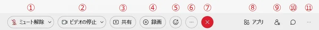 画面の下部にボタンが並んでいます.権限によってボタン自体が表示されなくなる,Webexのウィンドウの大きさによってボタンのラベルが表示されなくなるなど,見え方が異なることもあります.