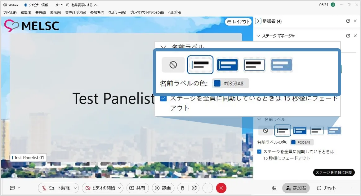 ※停止した場合,出席者はステージマネージャーで設定した背景などは利用することはできません.再度「同期」するとステージマネージャーで設定したレイアウトを使用できます.