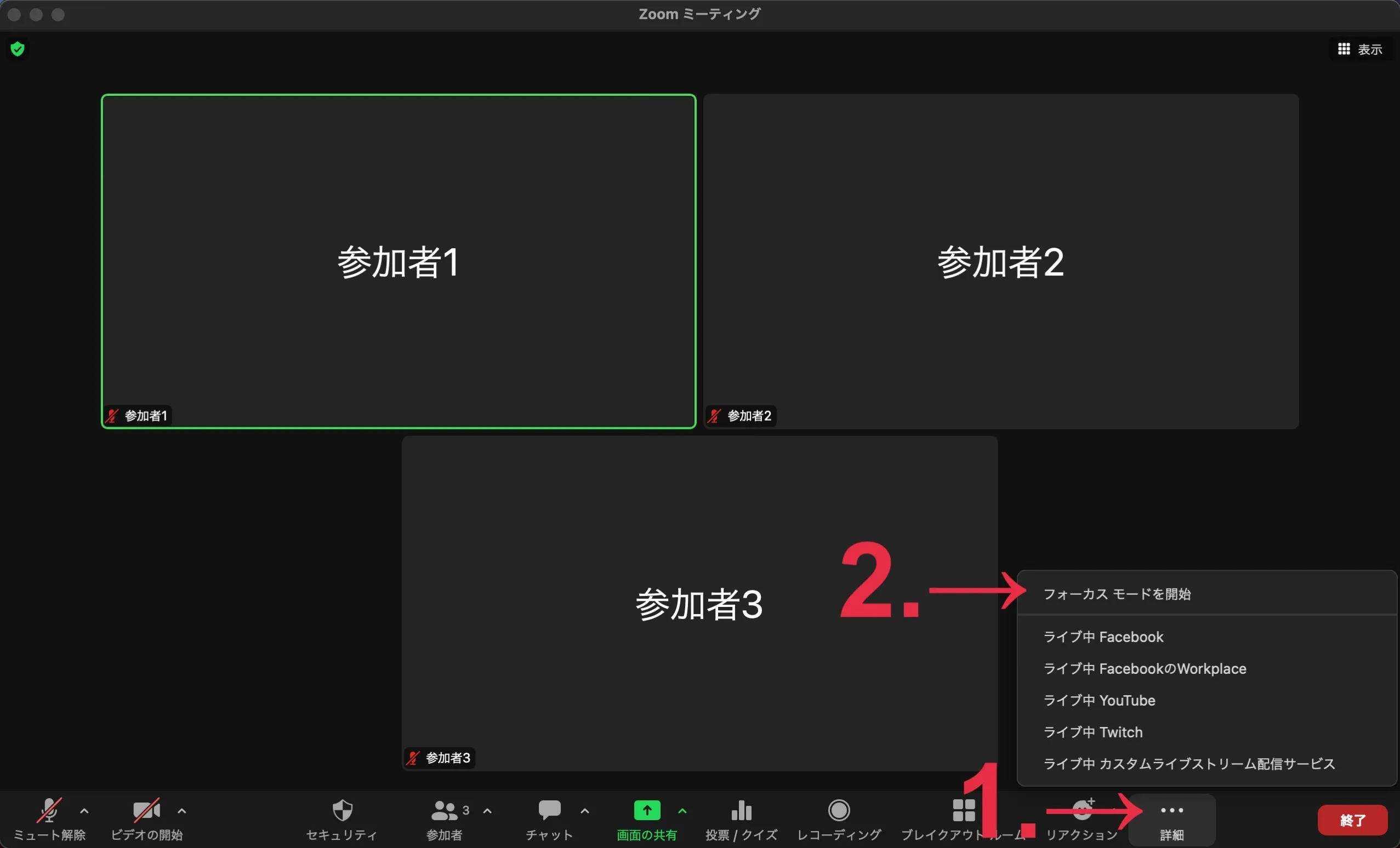フォーカスモードを終了したい場合,1.の後に表示されたメニューで「フォーカスモードを停止」を押してください.
