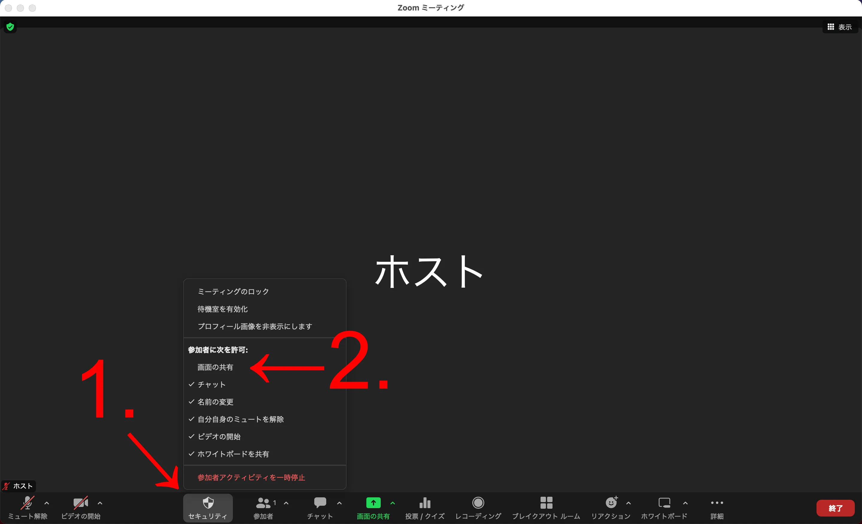 全員に画面共有を許可する(セキュリティ設定の変更)